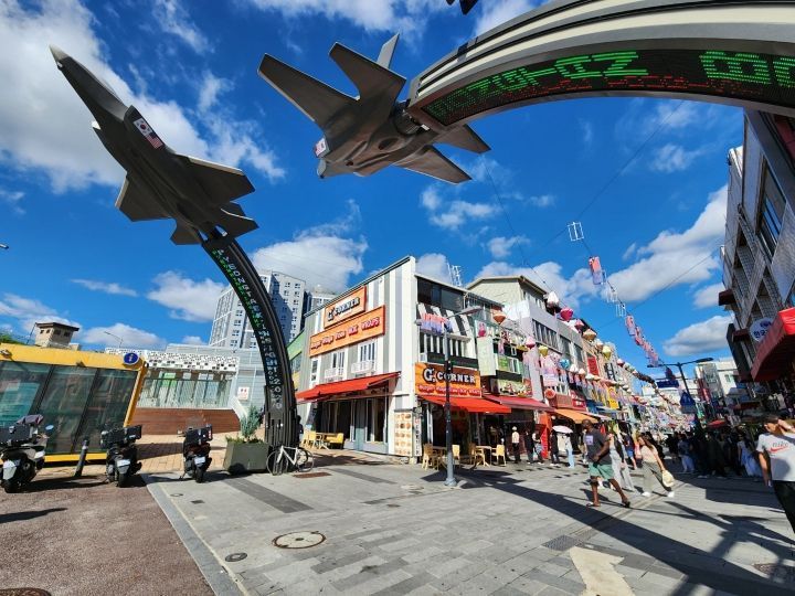 国際市場が形成された背景には、1950年代にこの地域に作られた米軍基地の存在があります。実際、国際市場の目の前に空軍基地があり、私が訪れた日は数分ごとに戦闘機の轟音が鳴り響いていました。通常の飛行機やヘリコプターの音とは比べ物にならないほどの爆音で、近くに住んでいる人は大変だろうと思います。少なくとも、「長く住めば慣れるでしょ」なんて軽々しく言えるレベルの音量ではありませんでした。